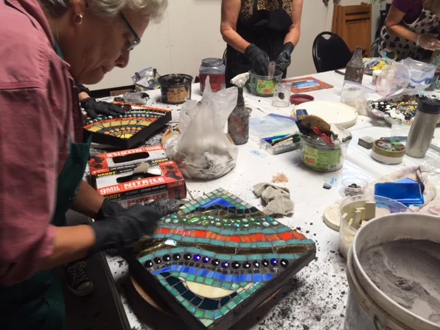 The project started with all participants tracing several versions of their own hands, right and left. We then watercolored and cut out our hands and pinned them up on the board. Each of us then selected a hand to embellish. After several rounds of embellishment the hands were curated and a composition was glued down. The final project was donated to Grateful Gatherings, a local non profit that transitions families out of homelessness.